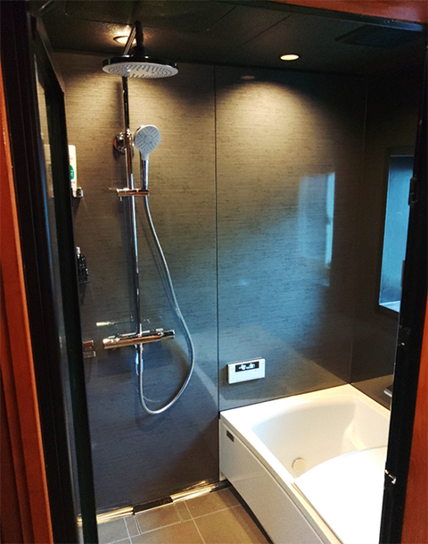 浴槽にヒビが入っていたため、浴室全体のリフォームをご検討されていました。オーバーヘッドシャワーで立ったまま身体を洗えるように、水栓位置や使用感をすり合わせてご提案しました。シックで落ち着いた雰囲気の浴室になり、お客さまに大変喜んでいただけました。【伊藤】